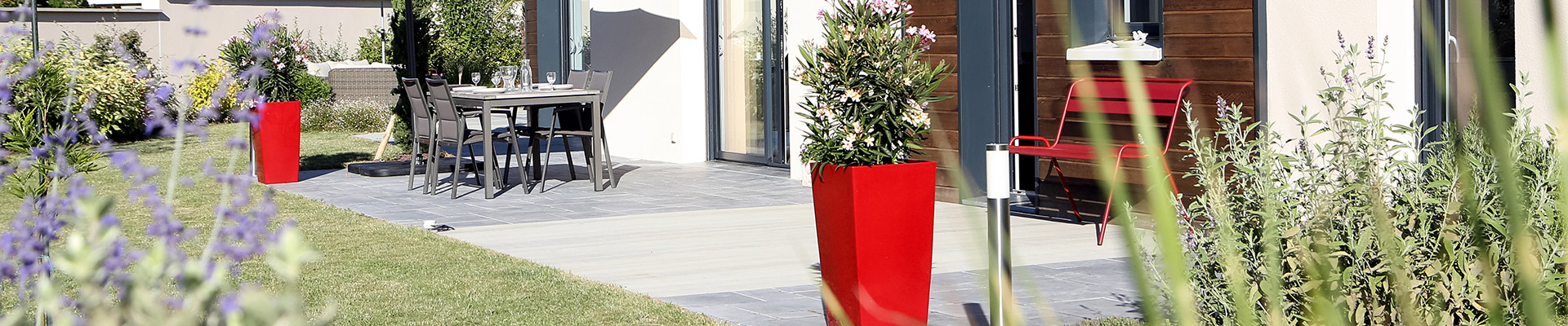 Enfin, côté décoration vous pouvez observer des touches de rouge. Cette couleur, choisi par le client, ressort dans divers éléments de mobilier (poterie, parasol, guéridon…). Cette touche de couleur apporte de la luminosité au jardin.